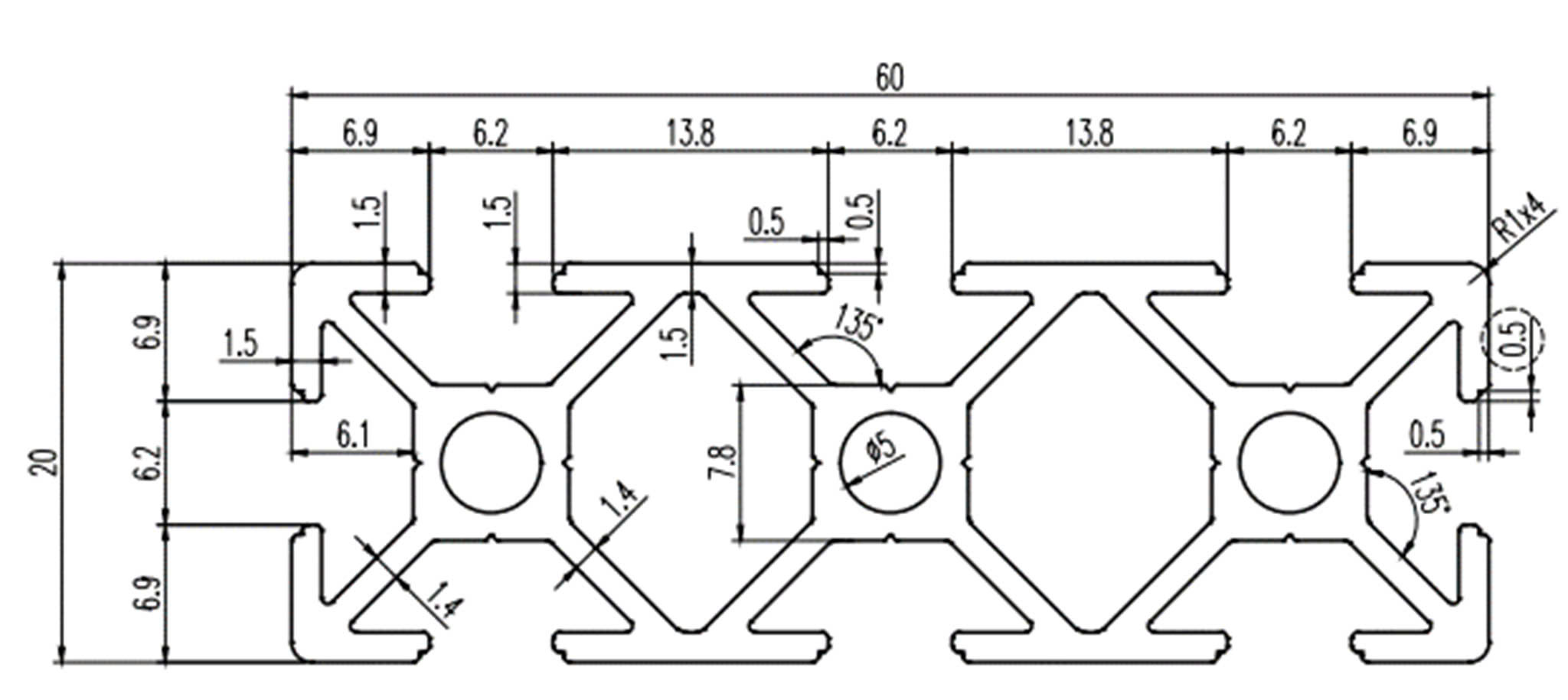 Hình ảnh mặt cắt nhôm định hình 20×60 (thực tế)